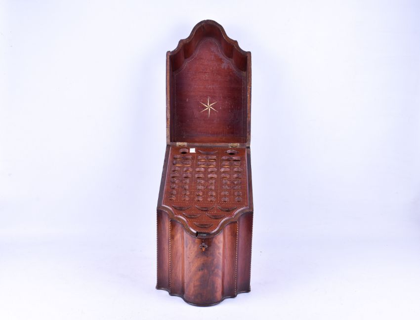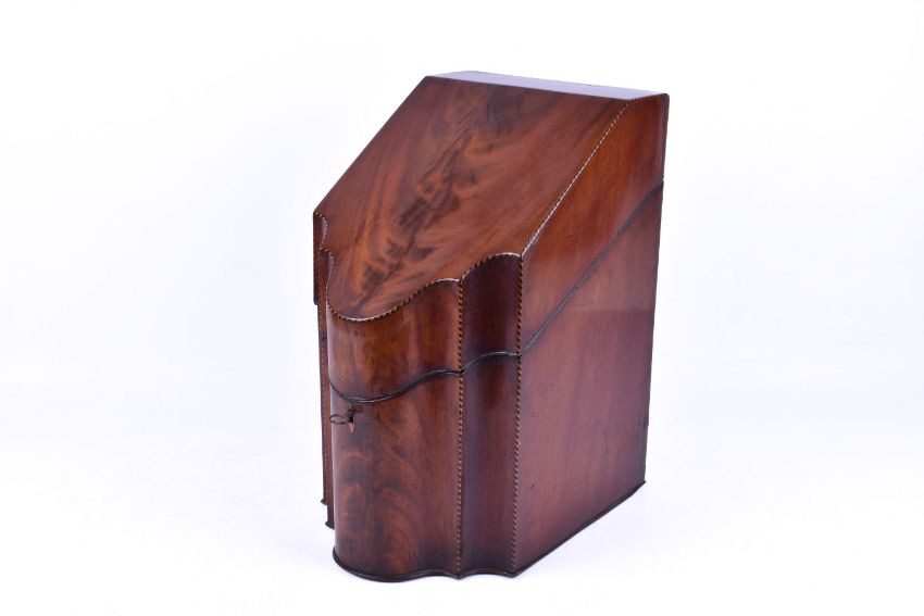 A Georgian mahogany cutlery knife storage box. Having serpentine front with a sloped lid. H38cm