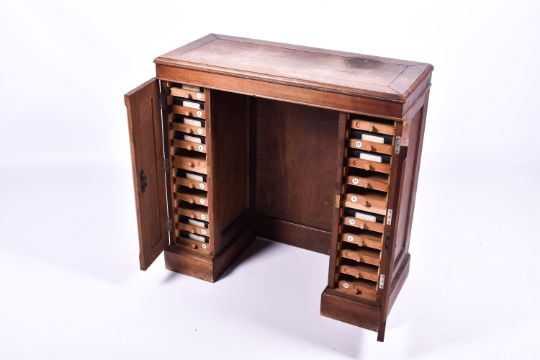 An early 20th century mahogany Jules Richard Taxiphote stereographic viewer stand / desk. Having numbered drawers for glass slide storage, with slide holders and some slides, flanking a knee hole. Raised on a plinth base. H75cm x W76cm x D35cm