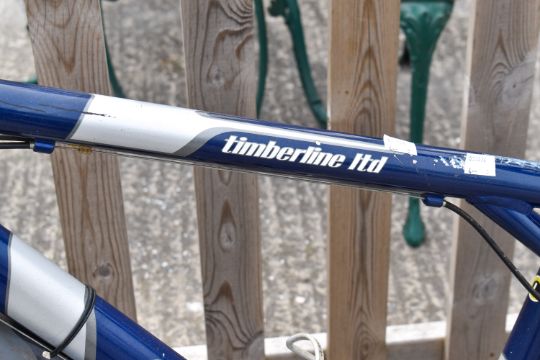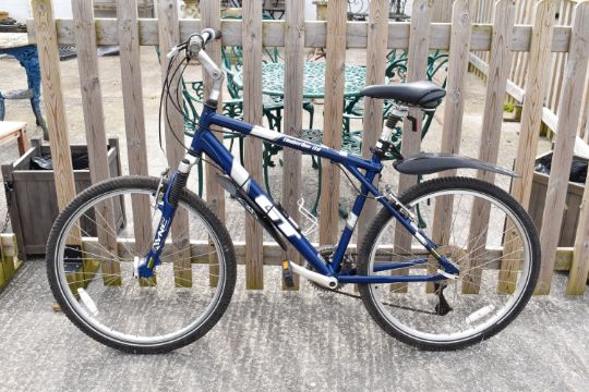 A blue GT Timberline 24 speed mens bicycle. 26' wheels. Tyres inflated and gears shift