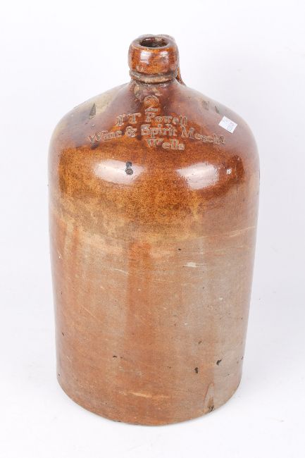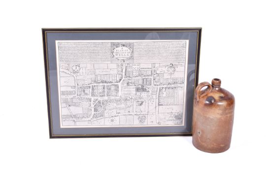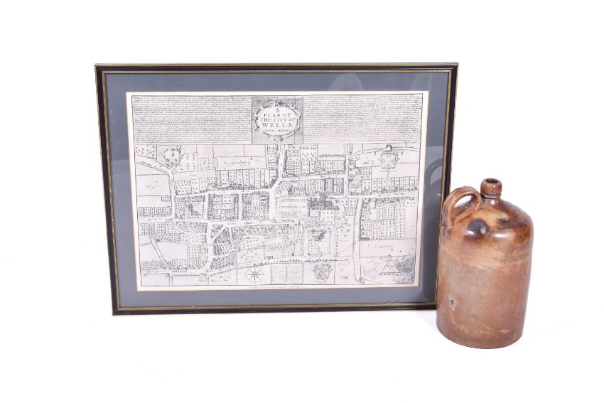 Wells, Somerset related items. Including a plan of the city by William Simes 71cm x 51cm, framed and glazed with a number 2 cider flagon stamped 'I T Powell', H40cm