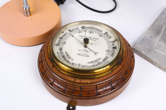 Cast aluminium model of an aeroplane, a barometer and a desk lamp. Largest H34cm. (3).