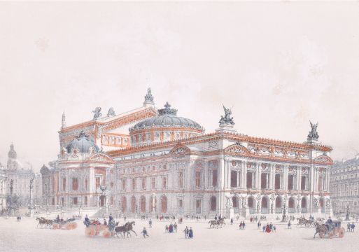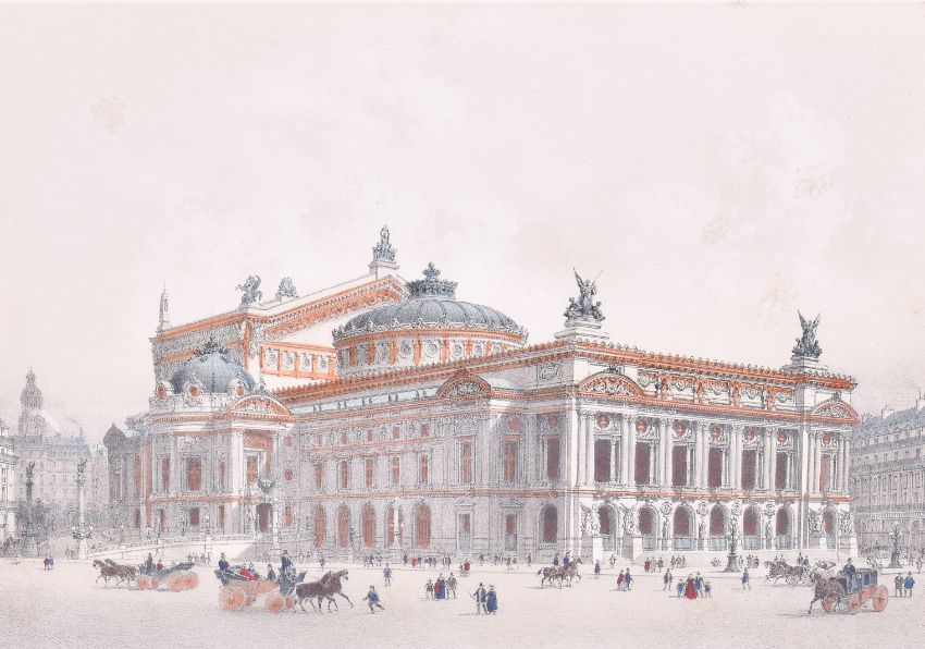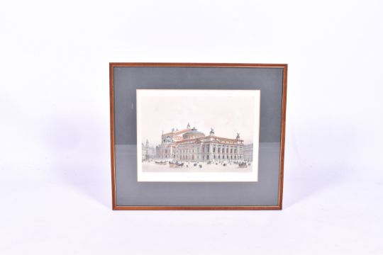 Le Nouvel Opera - 19th century hand coloured print. 39cm x 30cm, framed and glazed, 56cm x 48cm