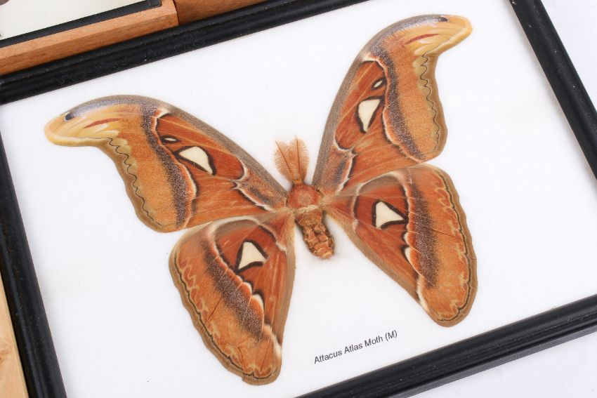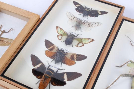 Five boxed specimen sets of insects. Including Mana Cicada, stick insect (Heteropteryx dilatata), Attacus Atlas Moth, this measuring 21cm wide, etc