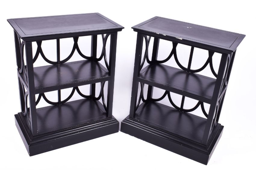 A pair of ebonised 'Perilune' bookcases attributed to OKA. Having 'X' supports and raised on a plinth base. H78cm x W62cm x D37cm