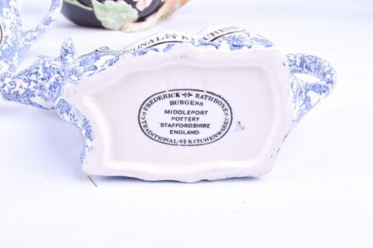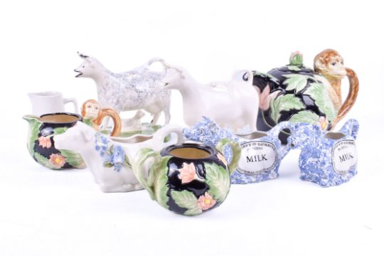 Collection of assorted 20th century ceramics. Including cow creamers and a Fitz & Floyd Majolica monkey three piece tea set. Largest H16cm