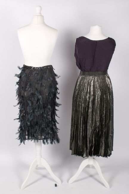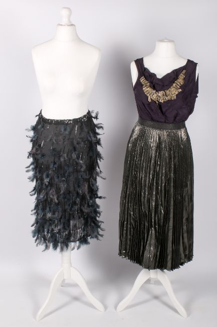 Three pieces of ladies designer eveningware. Comprising a Vera Wang purple silk top, decorated with metal beading and diamonte details around the neckline, size 4, a Tomasz Starzewski Couture black skirt, decorated with blue feathers and black sequins and beads, zip to the back, waist 30", length 70cm and a Christopher Kane metallic pleated skirt with a black lining, having an elasticated waistband, 27", length 80cm.