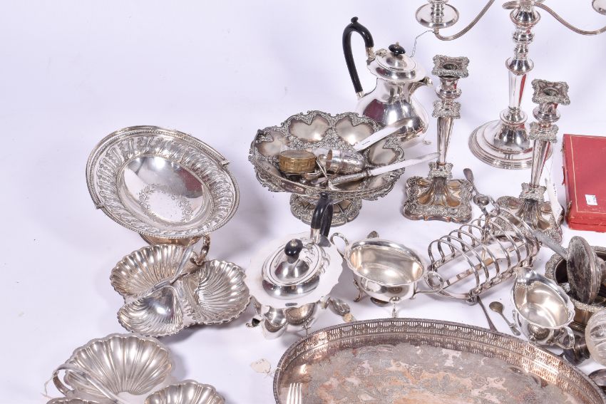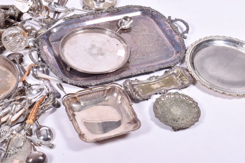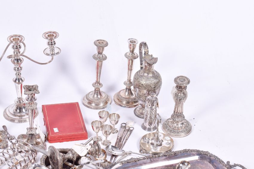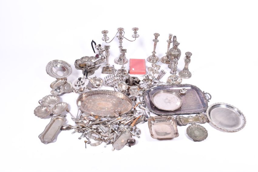 A large quantity of assorted silver plated wares in three boxes. Including candlesticks and trays, etc. Largest H36cm