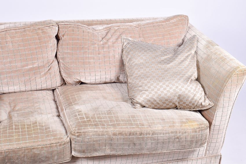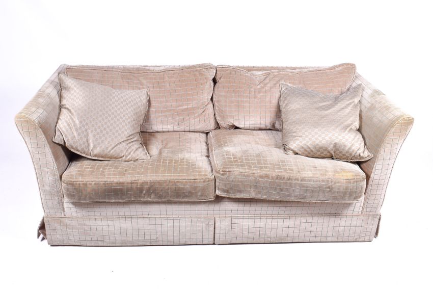 A contemporary low back two seater sofa. Having textured upholstery with feather filled cushions. H69cm x W176cm x D85cm