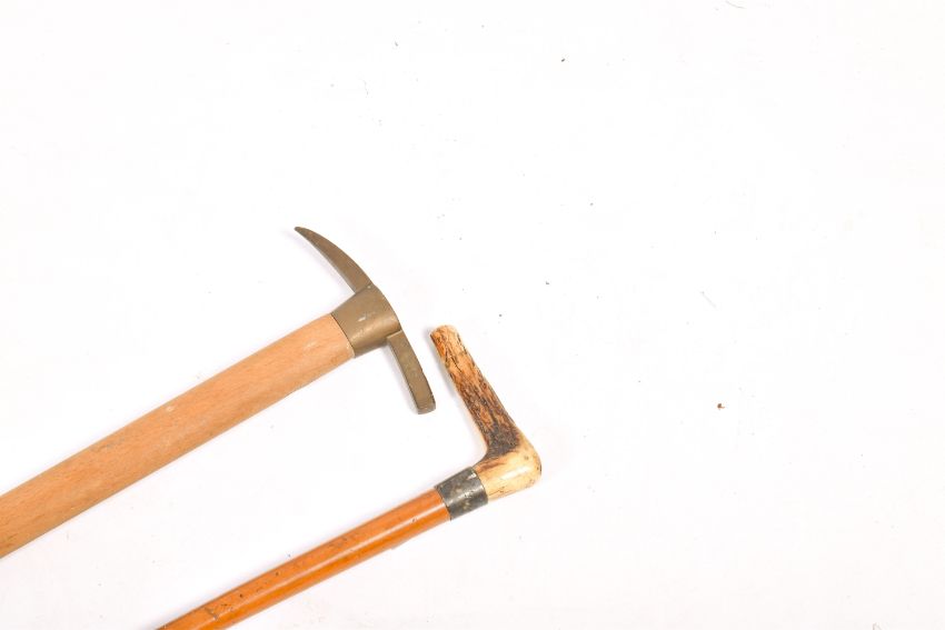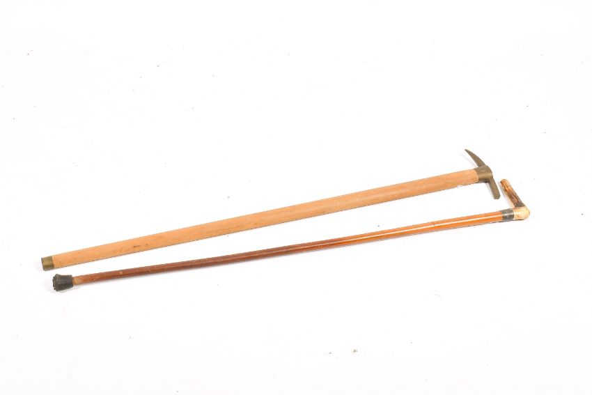 Two assorted walking sticks. Including Antler handled walking stick and an 'ice axe' type Zeche Monopol. 90cm long