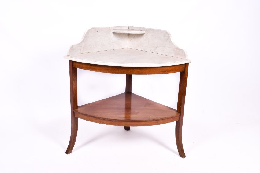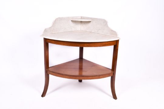 An antique marble top corner washstand. Marble gallery back with shelf sat on mahogany base with shelf, termintaing in swept feet. H91cm