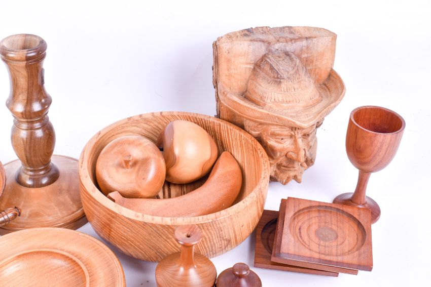 A large group of carved and turned treen items. Including several different bowls, animals and fruits, etc. Largest H18cm
