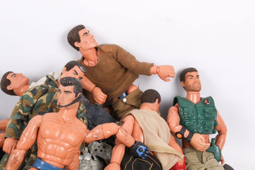 An assortment of Action Man figures and accessories. Including figures with articulated limbs and gripping hands, various outfits, weapons, etc.
