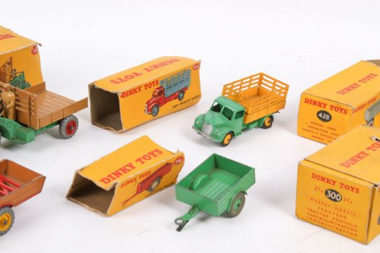 Six Dinky diecast industrial farming vehicles. Comprising a No.343 Farm Produce Wagon, green cab and chassis, yellow back and matching hubs, a No.342 Motocart, No.428 Trailer (large), No.320 Harvest Trailer, No.300 Massey-Harris Tractor and a No.341 Land-Rover Trailer. All in the original boxes.