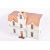 A modern dolls house with furniture. Having a light blue exterior, a central tower, shingled roof and balconies, front opening to reveal three storey tower flanked by four large rooms. H77cm x W90cm x D54cm