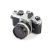 A silver Nikon FE 35mm SLR camera. With a 28mm 1:3.5 Nikkor-H Lens