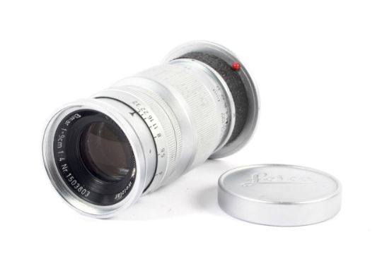 A Leitz Leica 90mm 1:4 elmar camera lens. Chrome M mount. Serial number 1503803
