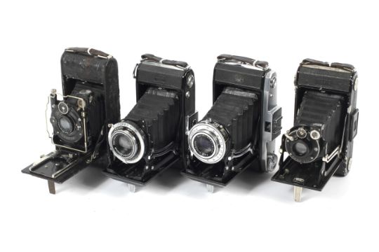 Four Zeiss Ikon 6x9 medium format folding cameras. To include a Nettar 515/2 with a Carl Zeiss Jena 105mm 1:4.5 Tessar lens, a Nettar 518/2 with a 105mm 1:4.5 Novar-Anastigmat lens, a Ikonta 520/2 with a 105mm 1:6.3 Novar-Anastigmat lens and Jcarette 500/1 with a 105mm 1:4.5 Tessar lens