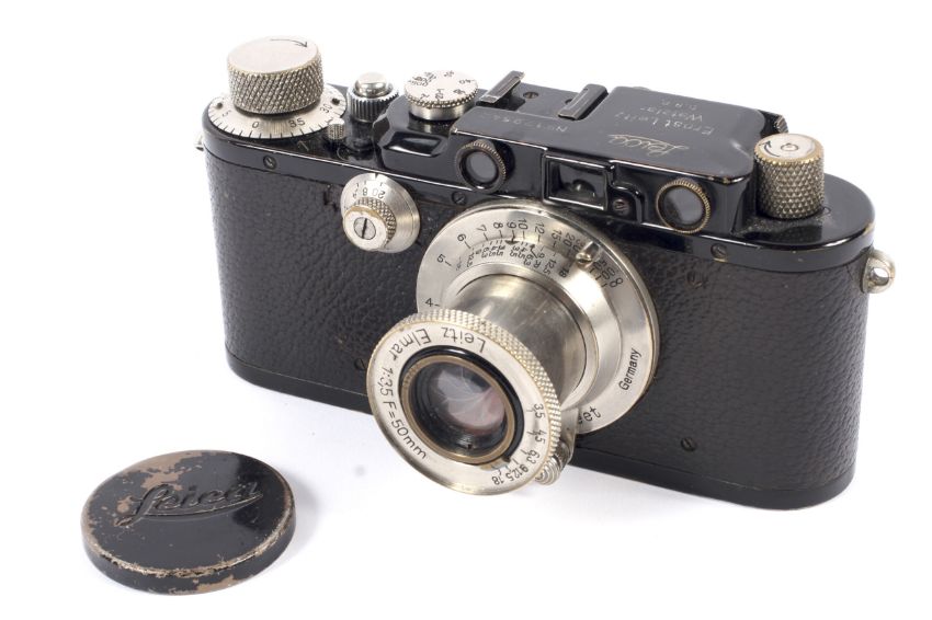 A Leica III 35mm rangefinder camera, black, 1935. With a 50mm 1:3.5 Leitz Elmar lens. Camera body serial number 172542.
