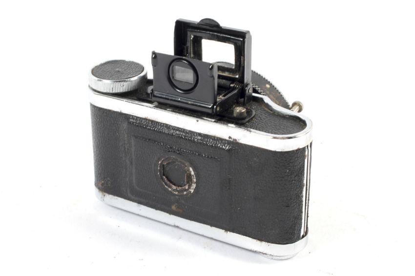 An Eljy Lumiere miniature camera with collapsible lens. In a leather case