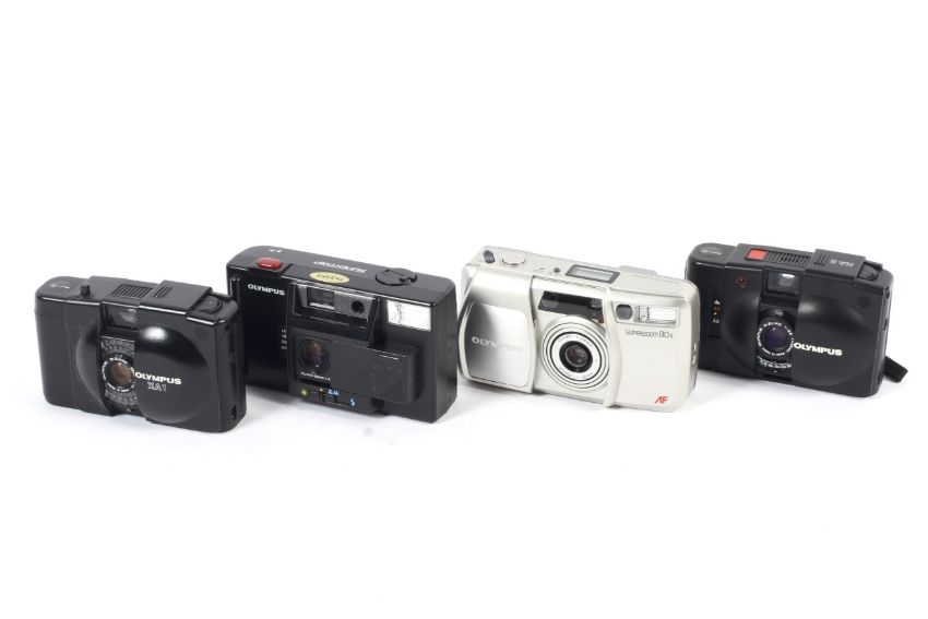 Four Olympus 35mm point and shoot cameras. To include a Superzoom 80s, a Supertrip, an XA1 and an XA2