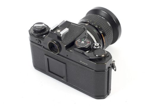 A black Nikon FE 35mm SLR camera. With a 35-70mm 1:3.3-4.5 Zoom-Nikkor lens