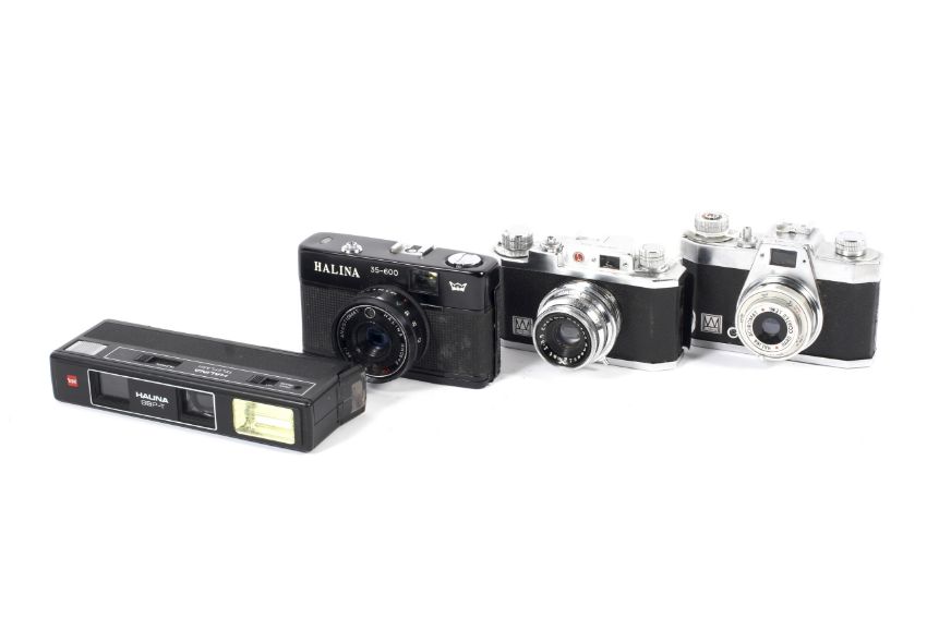 Four Halina cameras. To include a Halina Pet 35mm, Halina 35X 35mm, 35-600 35mm and a Halina SBP-T 110