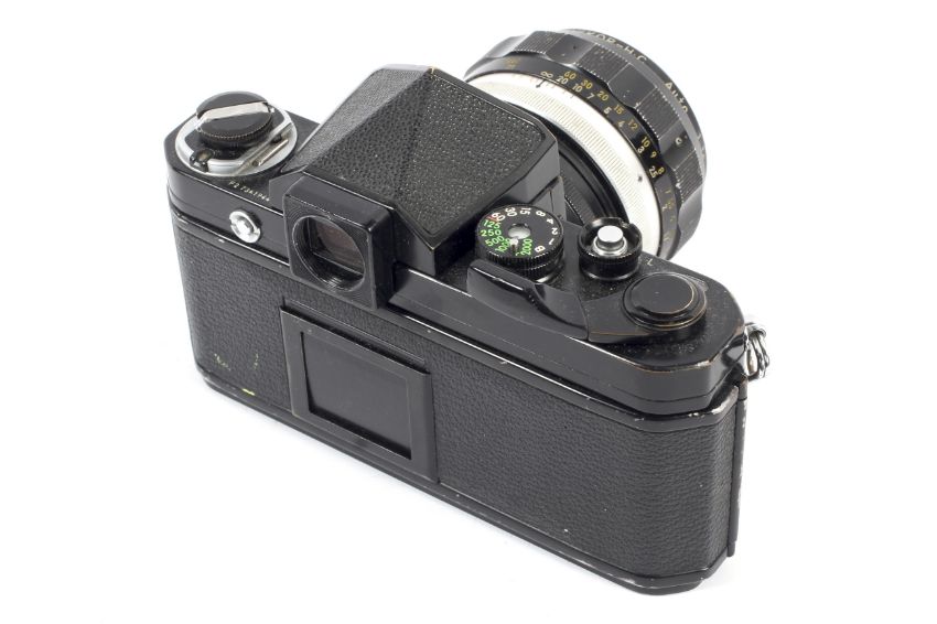 A black Nikon F 35mm SLR eye level camera. With an 85mm 1:1.8 Nikkor-H.C lens
