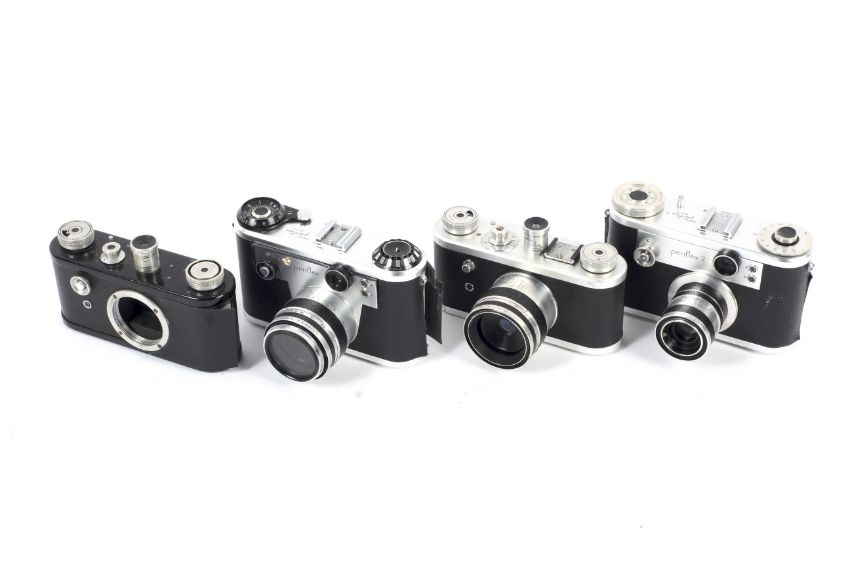 Four Corfield Periflex 35mm cameras. To include a Periflex with a Lumax 45mm 1:2.8 lens, a Periflex 2 with a Lumar-X 50mm 1:3.5 lens, and two more