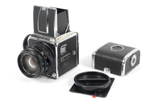 A Hasselblad 500 C 6x6 medium format camera. With a Carl Zeiss 80mm 1:2.8 Planar lens, waist level finder and 120 film back. Missing crank wheel
