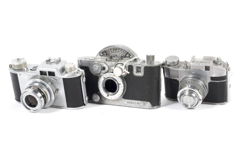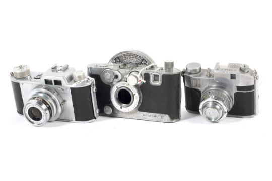Three unusual rangefinder cameras. To include a Mercury II Model CX 35mm half-frame body, a Bencini Comet S 127 4x3 and an Aka Akarette 35mm with a Schneider-Kreuznach Radionar 50mm 1:3.5 lens