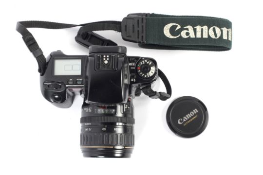 A Canon EOS Elan 35mm SLR camera. With a 28-80mm Canon Ultrasonic lens