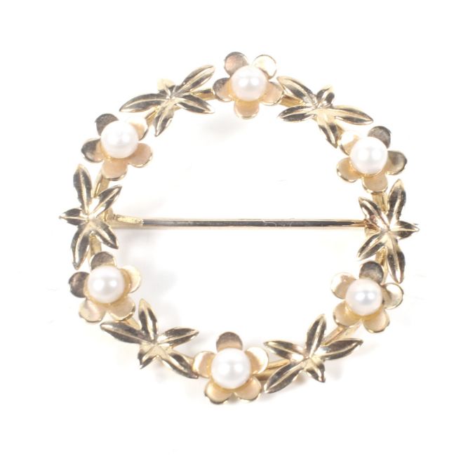 A vintage Scottish 9ct gold and pearl brooch. In the form of an open floral circlet formed of small pearl flower-heads with leaf cinque-foil spacers, hallmarks for Payton, Pepper & Sons Ltd, London 1978, approx. 33mm diameter, 3.9g gross; together with a Cairncross of Perth box and