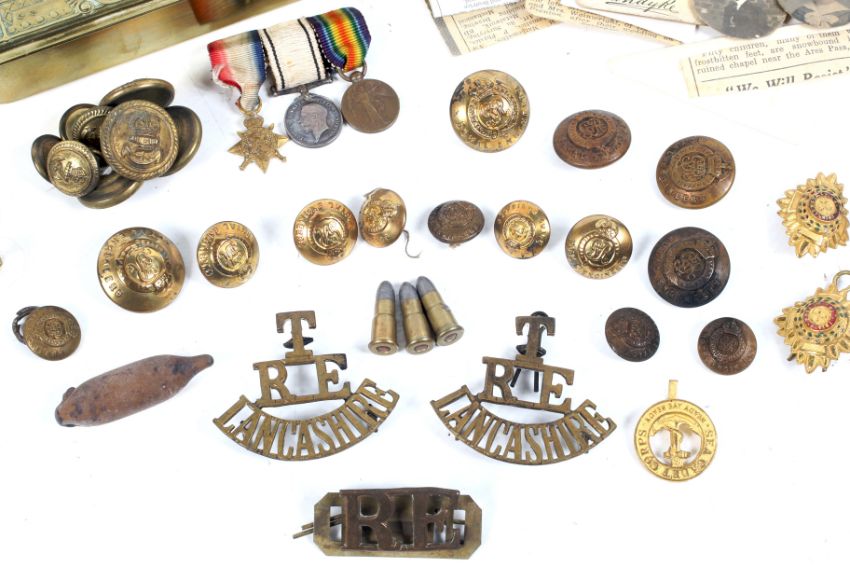 A Queen Mary Christmas 1914 tin and collectables. The tin containing a WWI miniature medals set, military badges and buttons, etc. The buttons including for the Royal Engineers, badges for TRE Lancashire, and assorted paper ephemera, etc.
