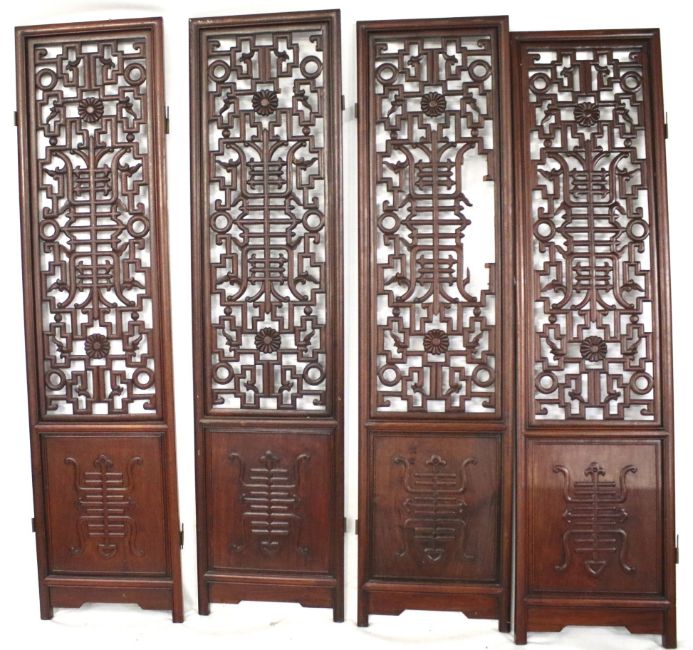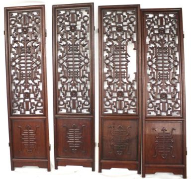An oriental hardwood four panel screen. With pierced decoration. Each panel 45cm x 183cm
