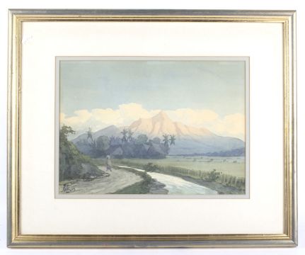JA Linus, watercolour. Depicting a view of a river before a group of houses with a sun-lit mountain behind, signed (lower right), 26cm x 37cm, framed and glazed