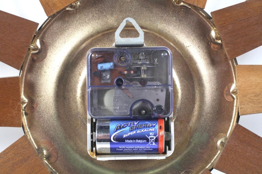 A 1970s vintage Paico teak and metal sunburst battery operated clock. With a brass dial and Roman numerals. Diameter 57cm