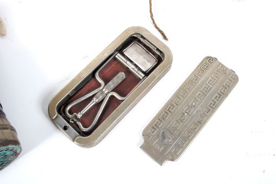 Three WWII related items. Comprising a signal corps box kite in original tube, instruction label faded/damaged, a gas mask, stamped LOT A262, PBC OCT 3 1941, and a circa 1930s Rolls Razor Strop boxed set, including sharpening stone.
