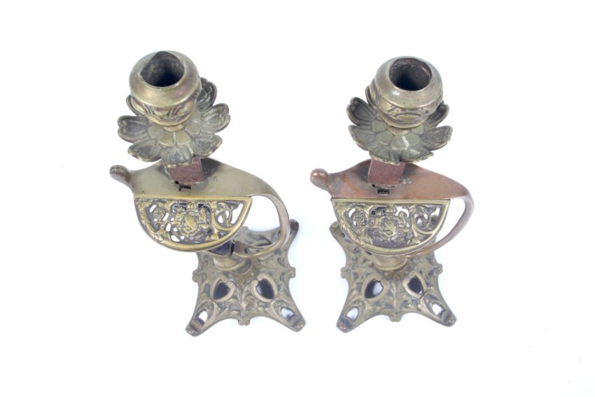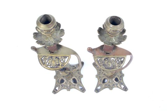 A pair of sword hilt candlesticks. The sword guards pierced with crown and lion coat of arms, with brass candle holder with flower shaped drip tray and pierced brass foot. Circa H28cm
