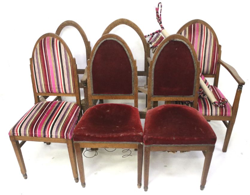 A set of six circa 1900 oak lancet shaped dining chairs. Comprising two carver chairs and four dining chairs, two have been re-upholstered in Designers Guild Cloth, the lot includes an additional roll of the matching fabric already pre cut for the remaining chairs and piping, the tallest H102cm