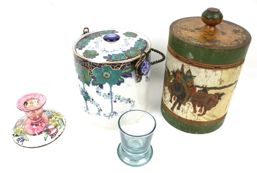 A group of four collectables. Including Briar Ware biscuit barrel, a Maling candlestick, glass beaker, etc.