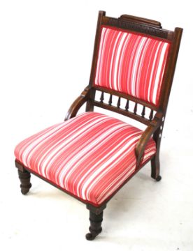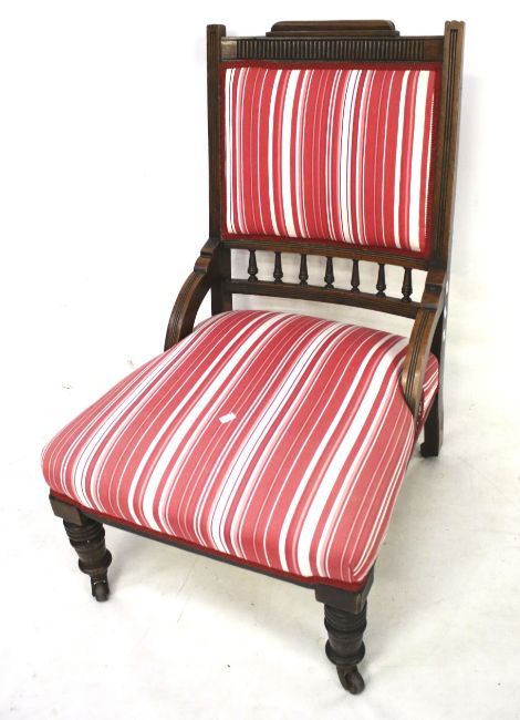 An Edwardian wooden framed chair. Upholstered in red and white striped fabric, raised on turned supports and casters. H98cm