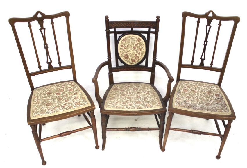 A pair of early 20th century mahogany inlaid chairs and an open armchair. The pair of chairs raised on turned supports united by stretchers, H93cm, the armchair upholstered with floral fabric, H86cm
