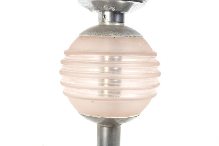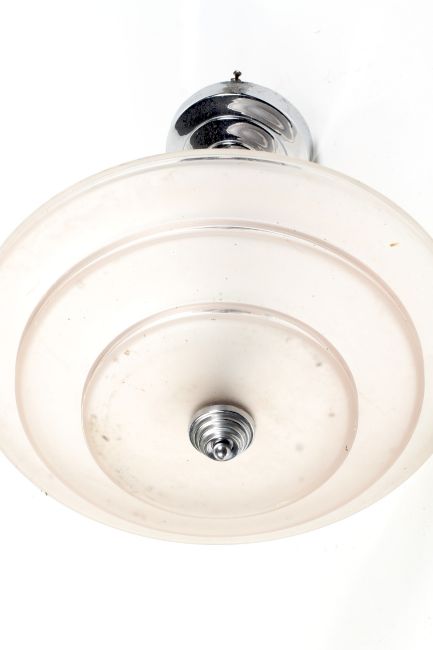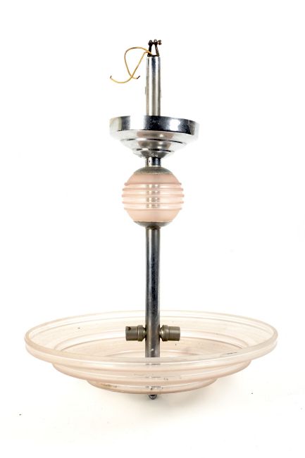 An Art Deco pink glass and chrome ceiling pendant light. Diameter 41cm H52cm