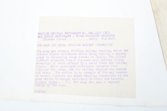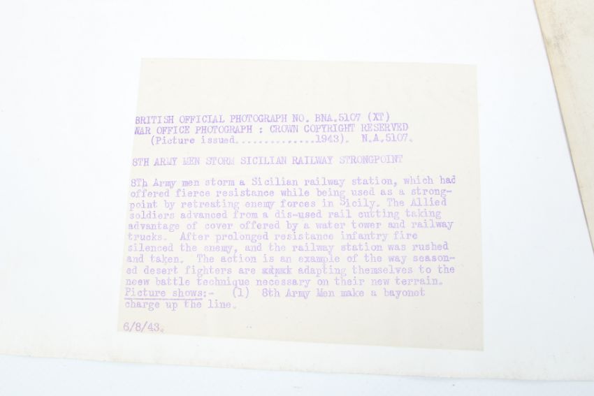 Four British Official War Office WWII photographs of military scenes. With paper labels to verso: No BNA 5107, issued 1943, 8th Army men storm Sicilian railway strongpoint; No BM I522, with a machine gun battalion in action; No BM 15392, issued July 1942, Scots Guards 60 into action at El XXXX Ala Ein; one with remains of official paper label. All circa 40.5cm x 50.5cm