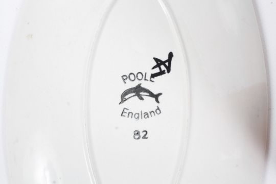 Two mid-century Poole Pottery Delphis items. Comprising an orange cylinder vase and red shield dish. Max. H23cm