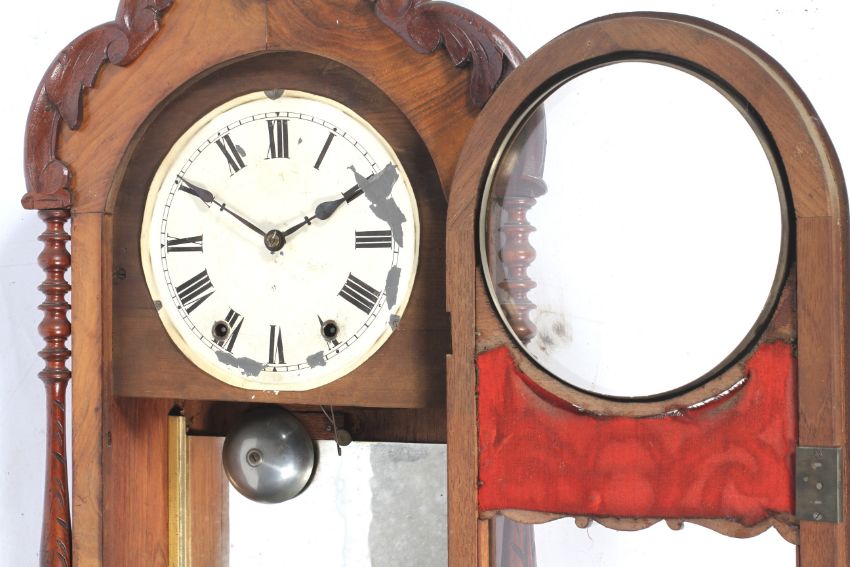 A late 19th century American eight-day walnut wall clock. With 20cm dial, inlaid and carved decoration to case, H90cm x W39.5cm x D13.5cm