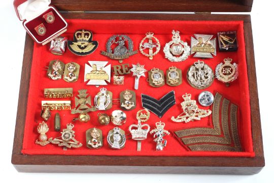 A wooden box containing a selection of military items. Including anodised cap badges for RAF, Royal Marines, Royal Artillery, and collar badges, cloth badges, cufflinks, Royal Engineers.