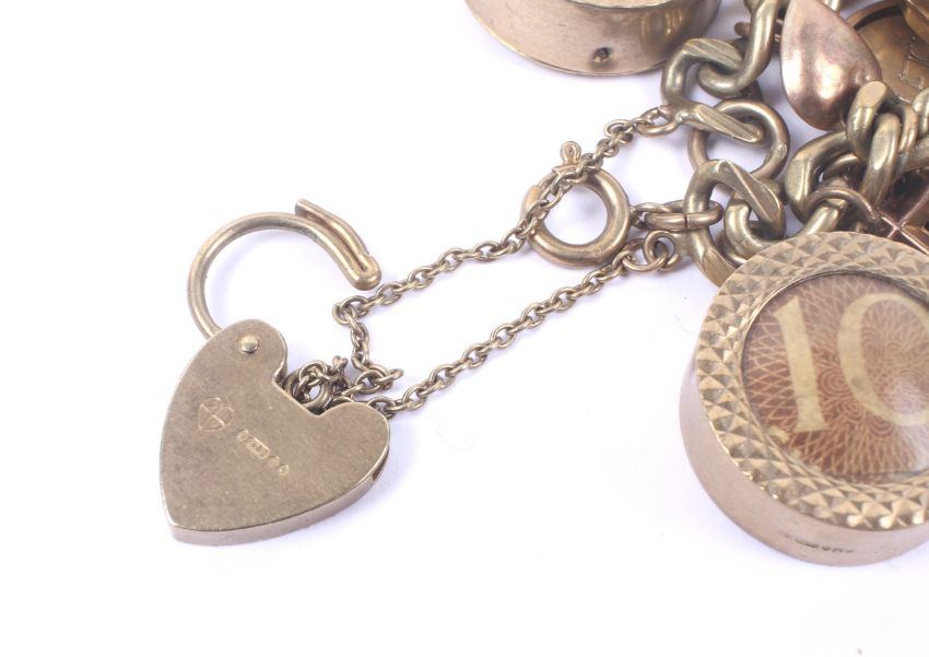 A 9ct gold curb link 'charm' bracelet on a heart-shaped padlock clasp. With hallmarks for London 1970 and hung with 26 various charms including; a fair ground roundabout, Tower Bridge, a Ronson type pocket lighter, a mug, a kangaroo, a boot, a watermill, a glazed ten shilling note round box n'Break in emergency', and a similar £5 note box and many others, various hallmarked and stamped, 59.2g gross
