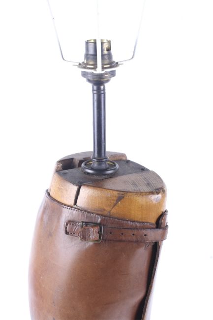 A novelty table lamp formed from a vintage leather riding boot. The light drilled through the boot tree, the boot fixed to a heavy granite base. Height to fitting 55cm.