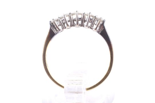 A vintage 18ct gold and diamond five stone ring. The slightly graduated round brilliants approx. 0.50cts total, all claw set in white on a yellow D-section shank with indistinct London convention hallmarks, size M, 2.9g gross